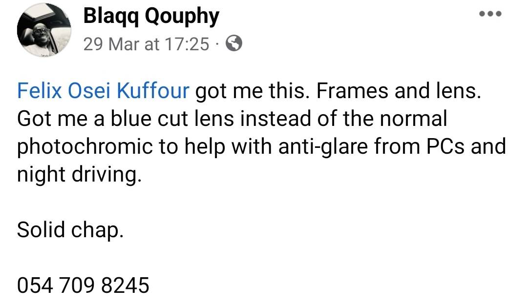 As a highly experienced optician with six years of experience in Ghana, I have gained an in-depth understanding of optical principles and the use of ophthalmic instruments. I take pride in my expertise and strive to stay updated with the latest advancements in the field to provide the best possible service to my clients. My experience has enabled me to handle a wide range of vision problems, and I am well-equipped to recommend suitable solutions to address them.